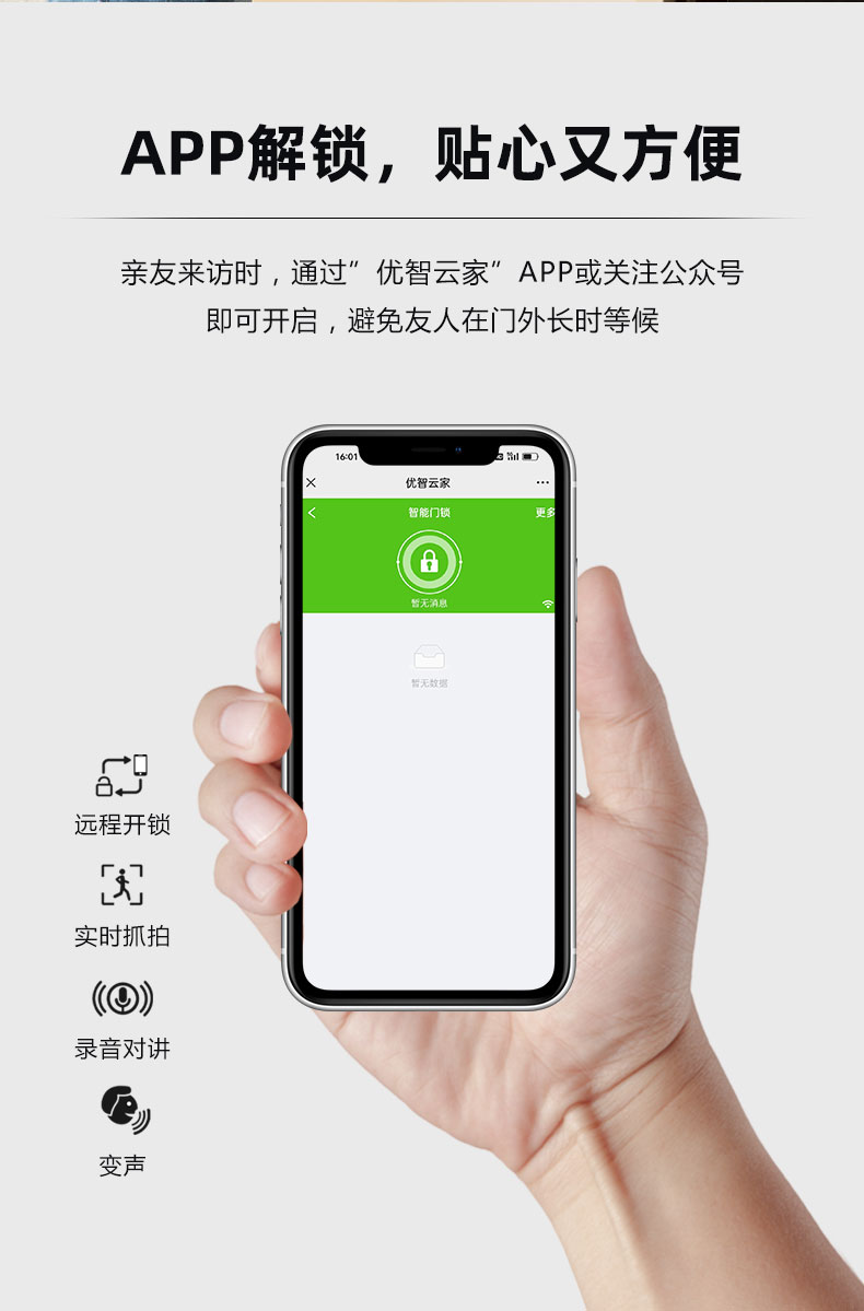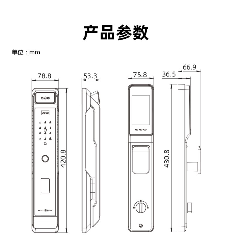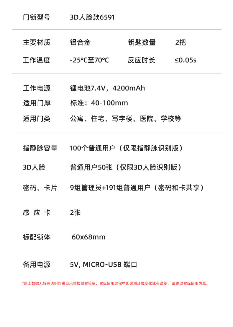 主要材質::鋁合金 鑰匙數量:2把 工作電源:鋰電池7.4V,4200mAh 適用門厚:標準:40-100mm 適用門類:公寓、住宅、寫字樓、醫院、學校等