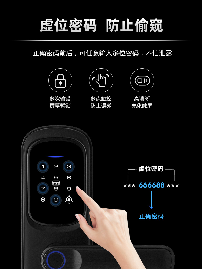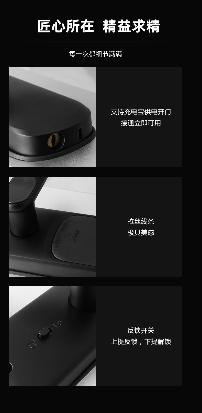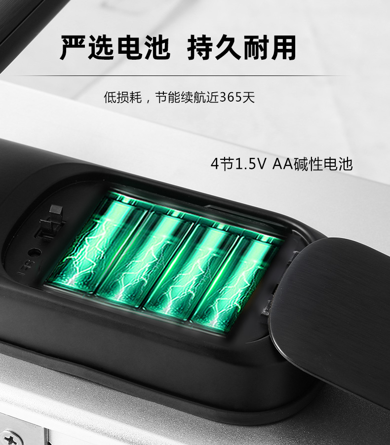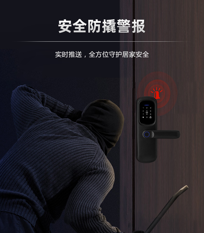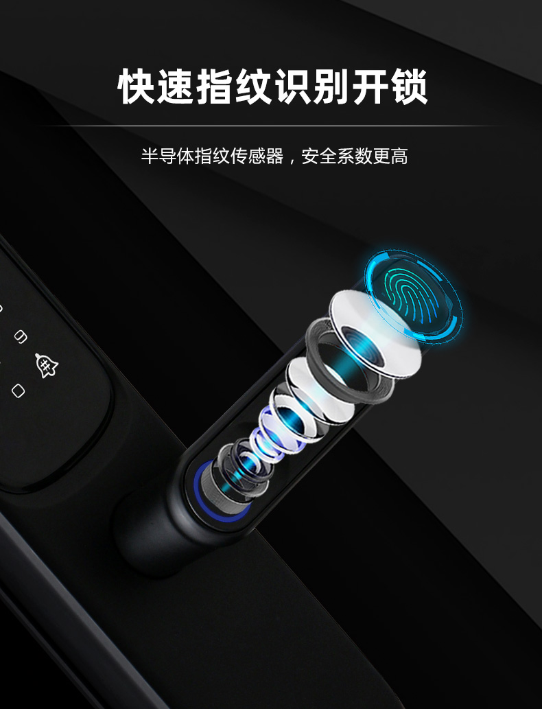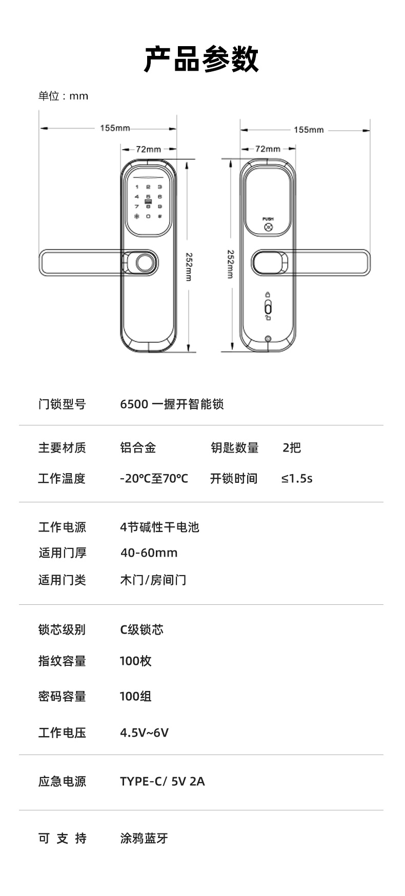 主要材質 :鋁合金 鑰匙數量 :2把 工作電源:4節堿性干電池 指紋容量:100枚 密碼容量:100組 適用門厚:40-60mm 適用門類:木門/房間門