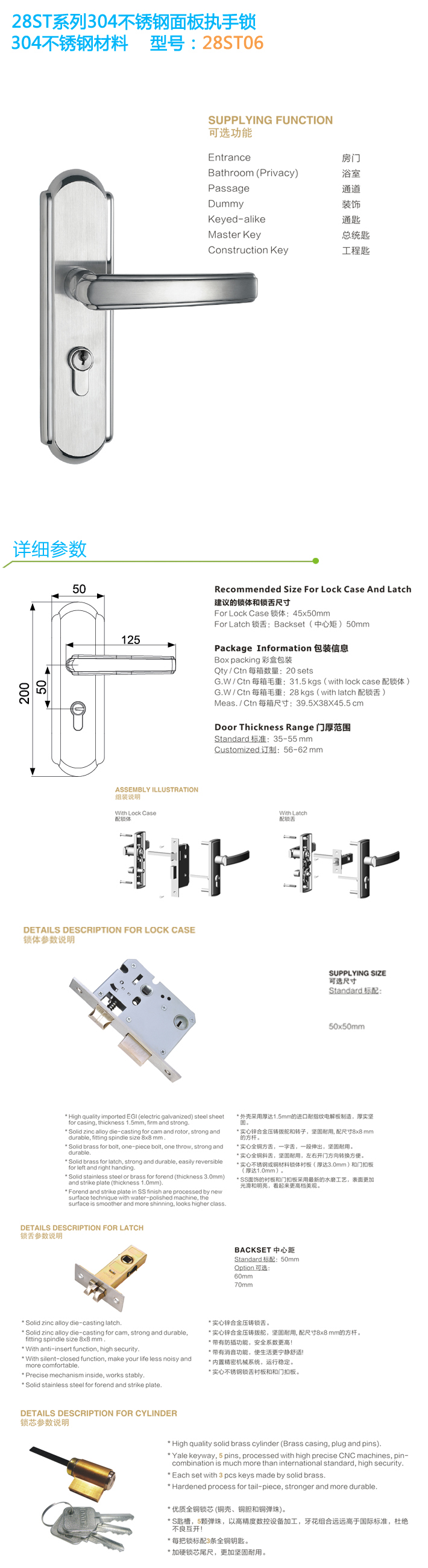 - 不銹鋼面板執手房門鎖 28ST03