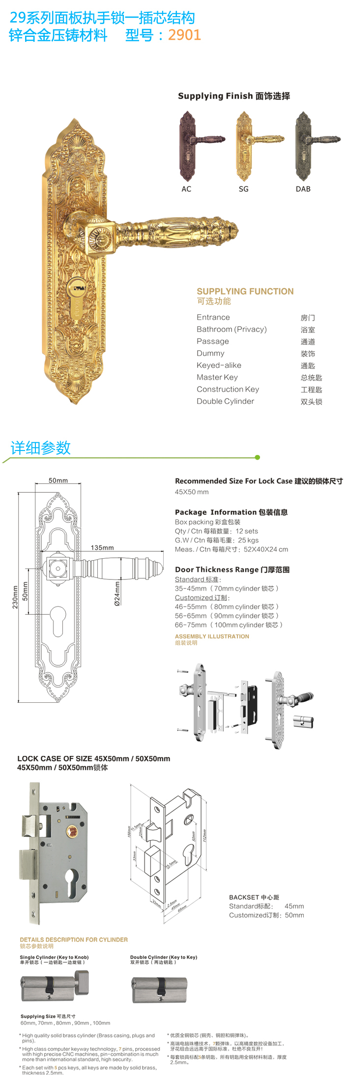 * 優質全銅鎖芯,標配5條全銅鑰匙