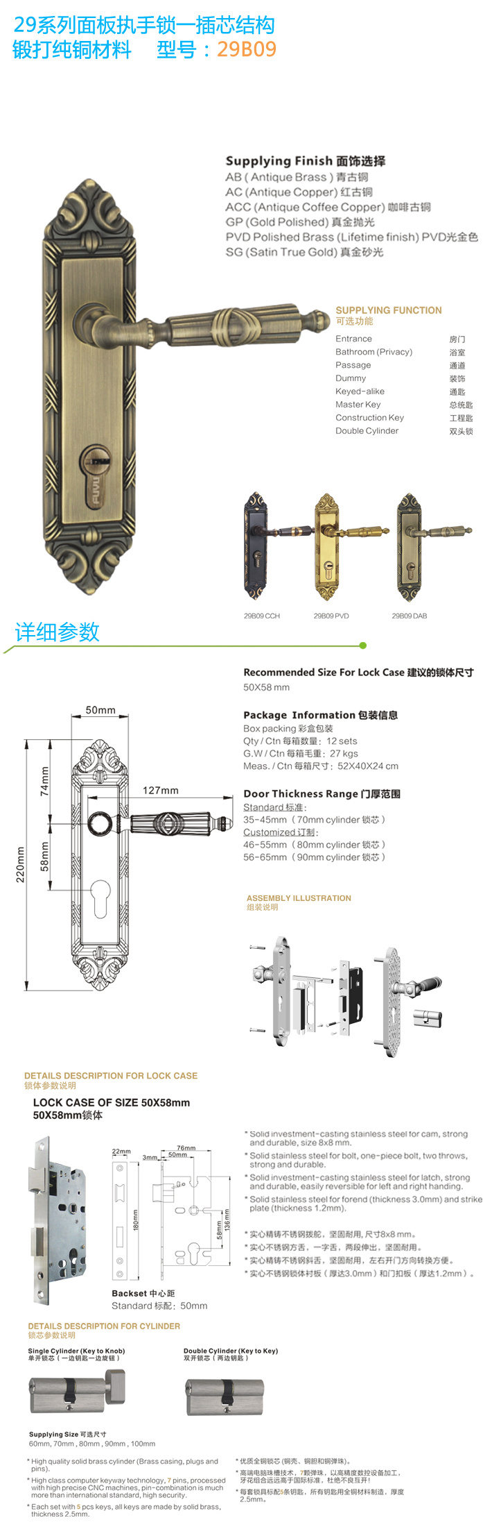 * 優質全銅鎖芯,標配5條全銅鑰匙