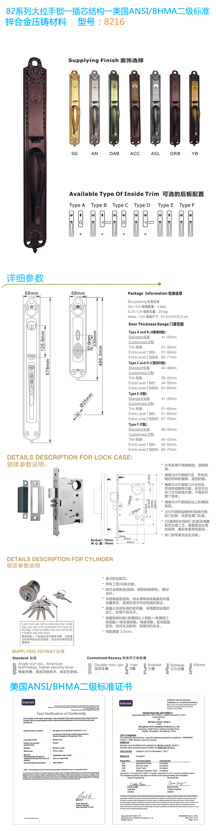 * 通過(guò)美國(guó)ANSI/BHMA GRADE二級(jí)認(rèn)證