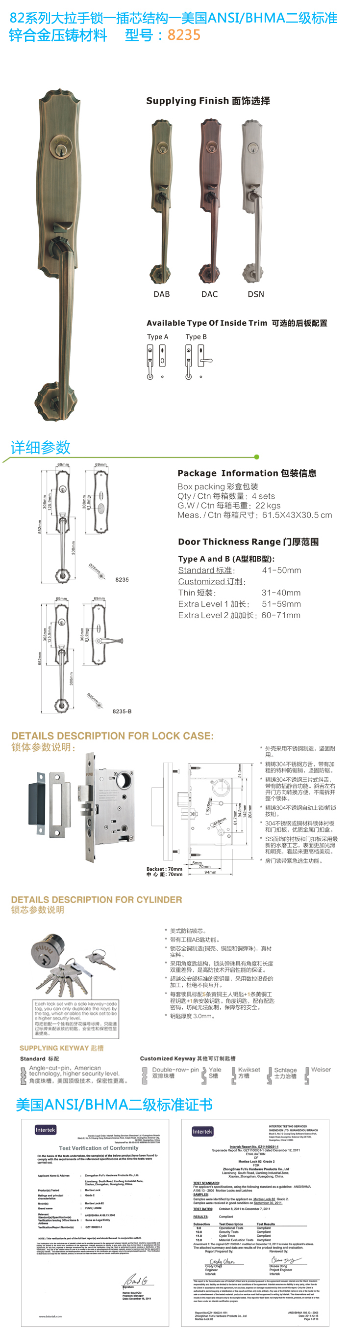 * 通過美國ANSI/BHMA GRADE二級認證