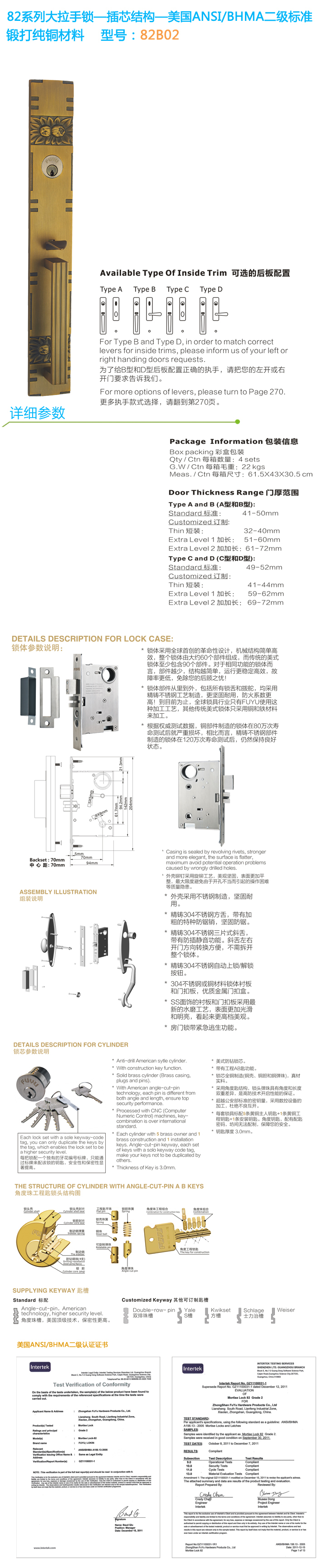 * 通過(guò)美國(guó)ANSI/BHMA GRADE二級(jí)認(rèn)證
