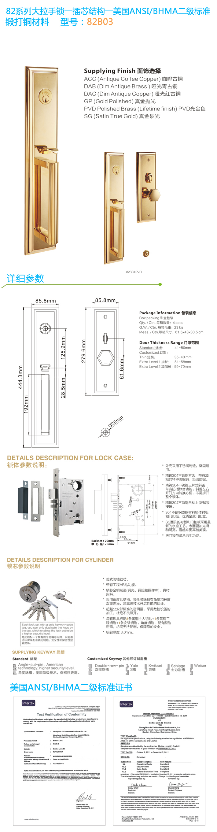 * 通過美國ANSI/BHMA GRADE二級認證
