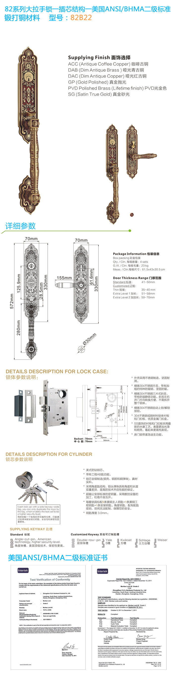 * 通過(guò)美國(guó)ANSI/BHMA GRADE二級(jí)認(rèn)證
