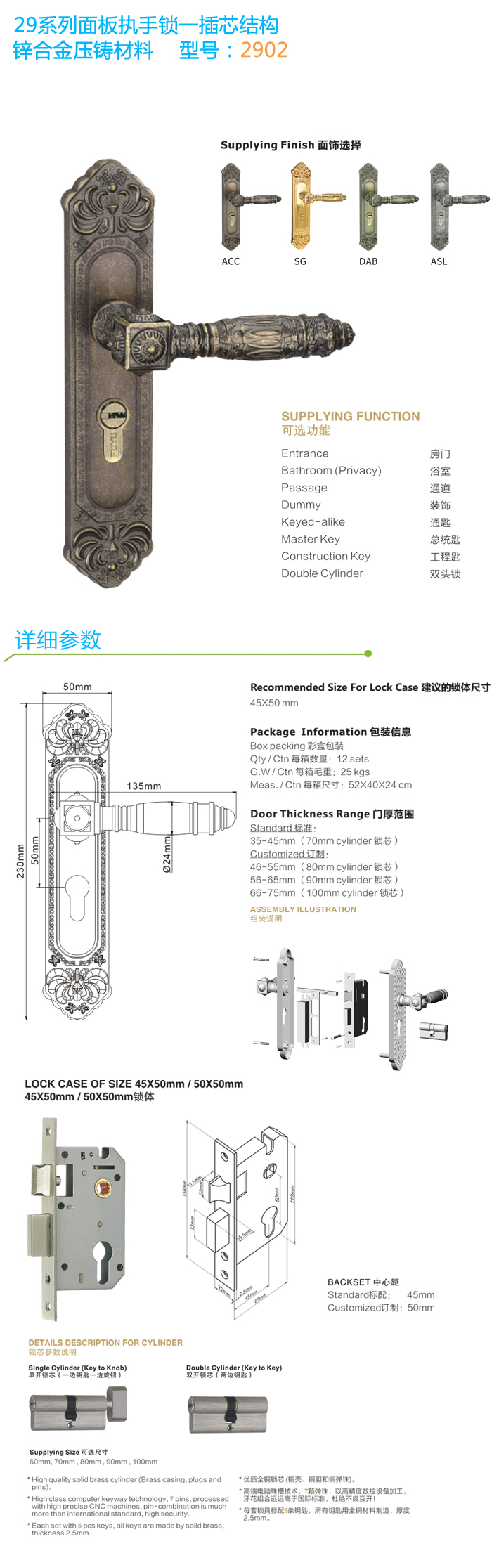 * 優質全銅鎖芯,標配5條全銅鑰匙